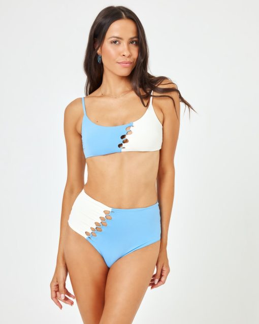 Have some fun chasing the sun in our Solstice Bikini Top. This color blocking bralette is all about the details with ladder seams that combine the aura + cream colors. Bralette Top Ladder Colorblock Detail Adjustable straps Size XS-XL Fabric Content: 97%Nylon, 3%Spandex Like all delicates, shape, color and fit are best preserved if hand washed in cold water. Lay flat to dry. Style # CBSOT23
