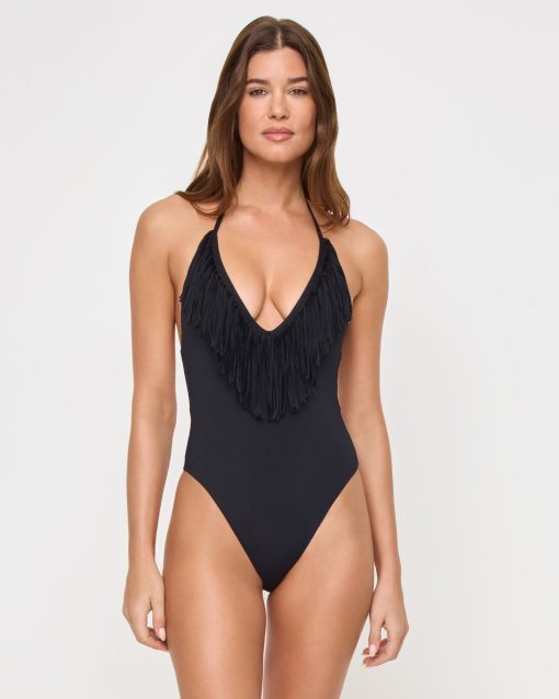 Guess who’s back, back again?! Fringe is back, tell a friend. The Desert Days One Piece brings our iconic fringe to the forefront of your next swim look. Featuring classic coverage, a super-deep v-front and ties at the neck and back — there’s no doubt you will feel your best when rockin’ this one. Bonus points — she doubles as a bodysuit when paired with denim.Deep V Tie at neck Tie at back Classic coverage Fringe at bust Classic Coverage Size XS-XL 82% Nylon, 18% Spandex Style # LSDEMC25