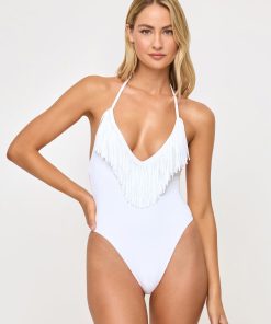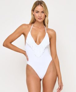 Guess who’s back, back again?! Fringe is back, tell a friend. The Desert Days One Piece brings our iconic fringe to the forefront of your next swim look. Featuring classic coverage, a super-deep v-front and ties at the neck and back — there’s no doubt you will feel your best when rockin’ this one. Bonus points — she doubles as a bodysuit when paired with denim.Deep V Tie at neck Tie at back Classic coverage Fringe at bust Classic Coverage Size XS-XL 82% Nylon, 18% Spandex Style # LSDEMC25