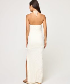 It’s totally okay to kiss and tell when you’re wearing our pucker up knit dress. The Lucca Dress is as unique as it is memorable all due to the gorgeous fabrication and thoughtful details. A halter neck with front keyhole, wood beading and a high side-slit combine to make this ankle-length number perfect for your next event, vacation or anything in between.Halter neck Keyhole in front Wood beading Ankle length Slit on side Pucker up knit 60% Cotton 37% Nylon 3% Spandex