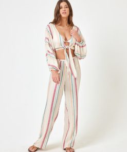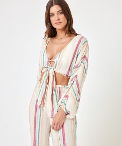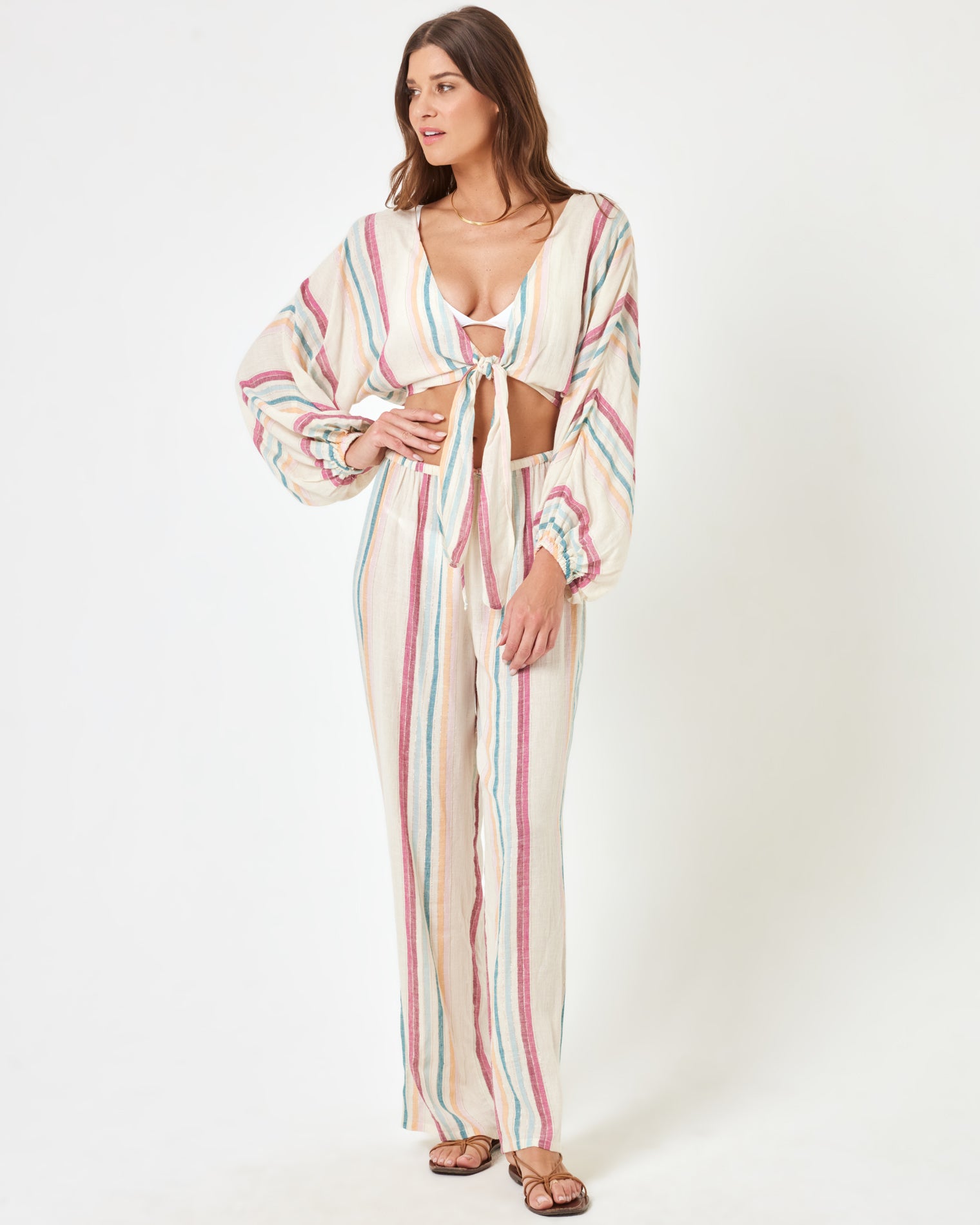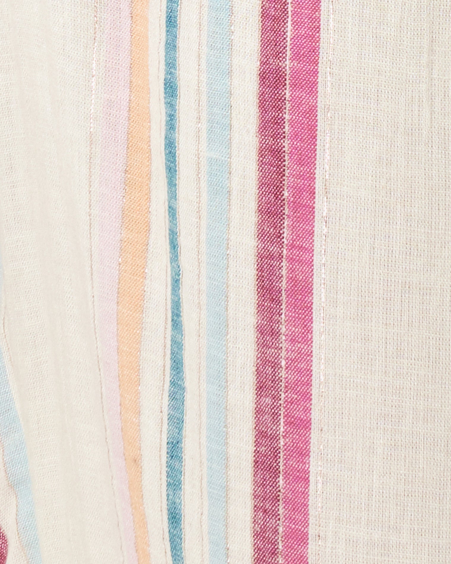 You can never have too many crop tops in your closet! The Reese is a head-turner with our It Comes In Waves metallic yarn-dye striped fabric, tie front + long bell sleeves. Create a set with the matching Lily pant or wear it with denim to switch things up.Long Belle Sleeve With Elastic Cuff Wrap Tie At Front V Neckline, Cropped Magic Hours Metallic Yarn Dye Stripe Tie Front Crop Top Size XS-XL 99% Viscose 1% Metallic Style # REETP23 Model Measurements: Maitlynn, size S – Height 5’9, Bust 34″, Waist 24″, Hips 35″