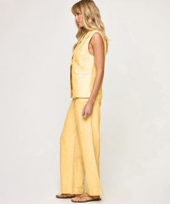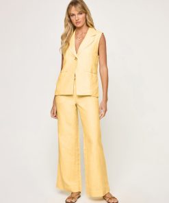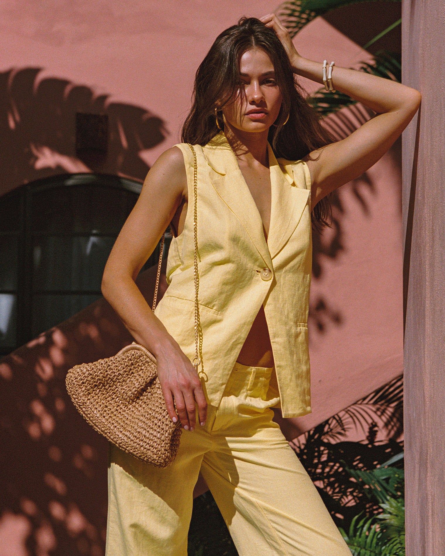 Stack your closet with tailored suiting and just watch as your productivity goes through the roof. Jk, but feeling put together definitely helps meet any goal that comes your way. The San Marco Vest is a sleeveless little number that features a button at mid waist, open bottom, collar and pockets at the front. Pair it with any of the shorts or pants from our new ready-to-wear separates collection. Sleeveless vest Button at mid waist Pockets at front of hips Collared Double breasted 54% Linen, 46% Cotton Style # SNMTP25