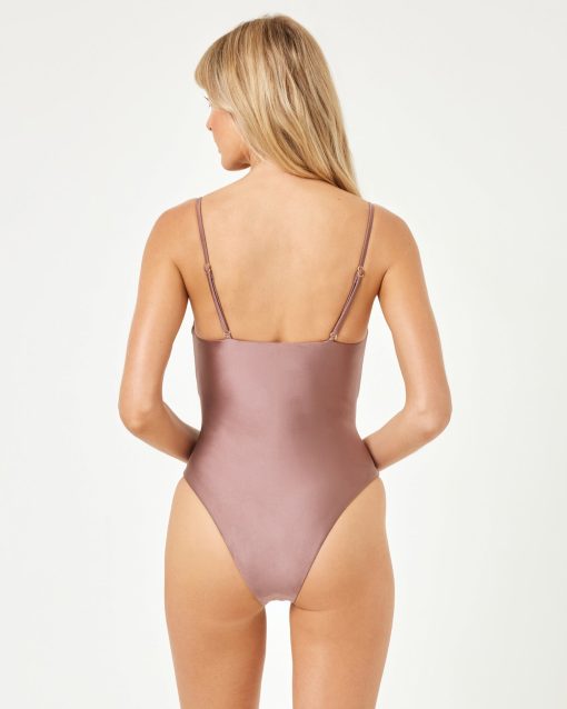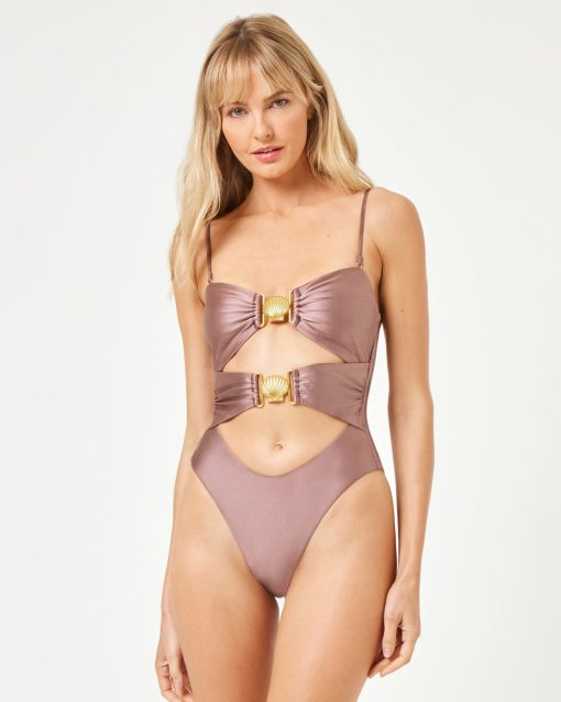 Double cut-outs FTW with the Seas the Day One-Piece. Two gorgeous gold seashells adorn the front and shine fabric makes this swimsuit feel super special and luxurious. Bitsy Coverage Shell Hardware Shine Fabric Cutouts on Stomach Removable Straps Removable Pads Adjustable Straps Size XS-XL 80% Nylon | 20% Spandex Style # SHSDMB25