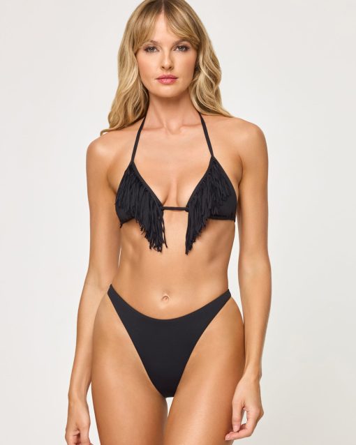 We love a good triangle top so we decided to get crazy and add fringe to our fave style. The Sienna boasts minimal coverage and support and features ties around the neck and back. The fringe at the cups is the icing on your cakes (wink, wink). Triangle top Tie around neck Tie around back Fringe at cups Size XS-XL 82% Polyester | 18% Spandex Style # LSSIT25